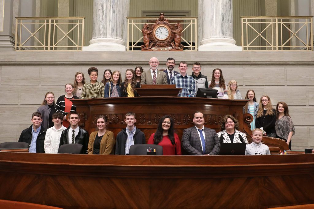 Senator White introduces staff and students from Neosho’s Ozark Christian Academy on the floor of the Senate before taking this photo with Rep. Baker.