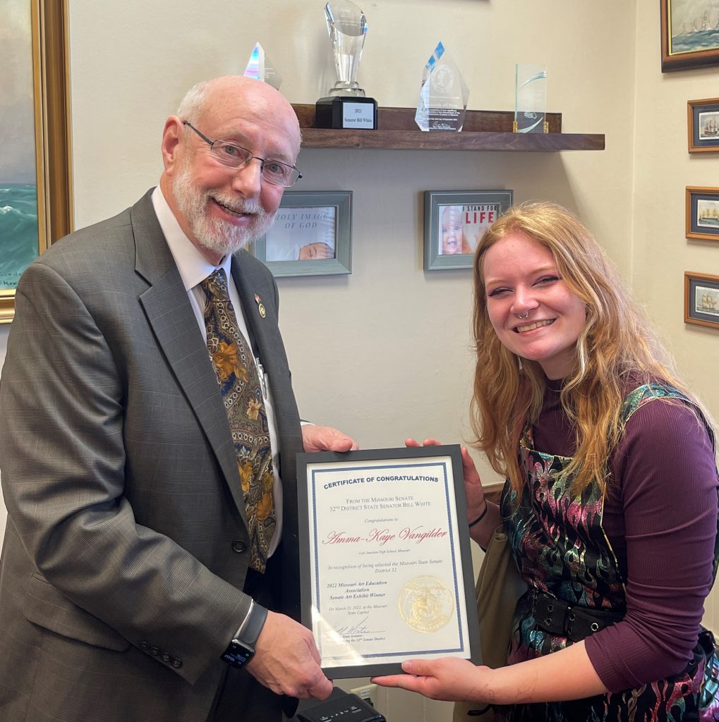 Senator White congratulates Carl Junction High School student, Anna Kaye Vangilder, whose artwork was chosen to represent the 32nd Senatorial District in the Senate Student Arts Exhibit.