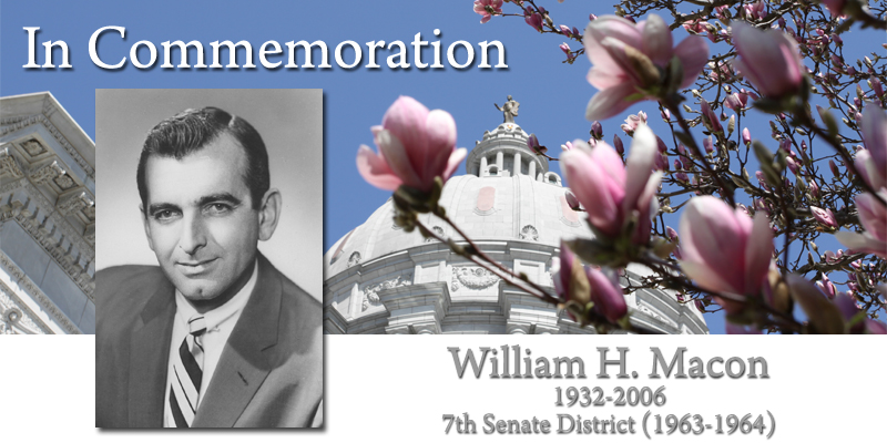 William H. Macon served the people of the 7th District (part of St. Louis County). Born in St. Louis, he received his education from Clayton public schools. Senator Macon was president of the insurance and loan brokerage firm W.H. Macon & Company. He enlisted in the U.S. Air Force in 1942 and was honorably discharged in 1946, with the rank of sergeant. Senator Macon was elected to the Senate in a special election in 1963. (Republican)