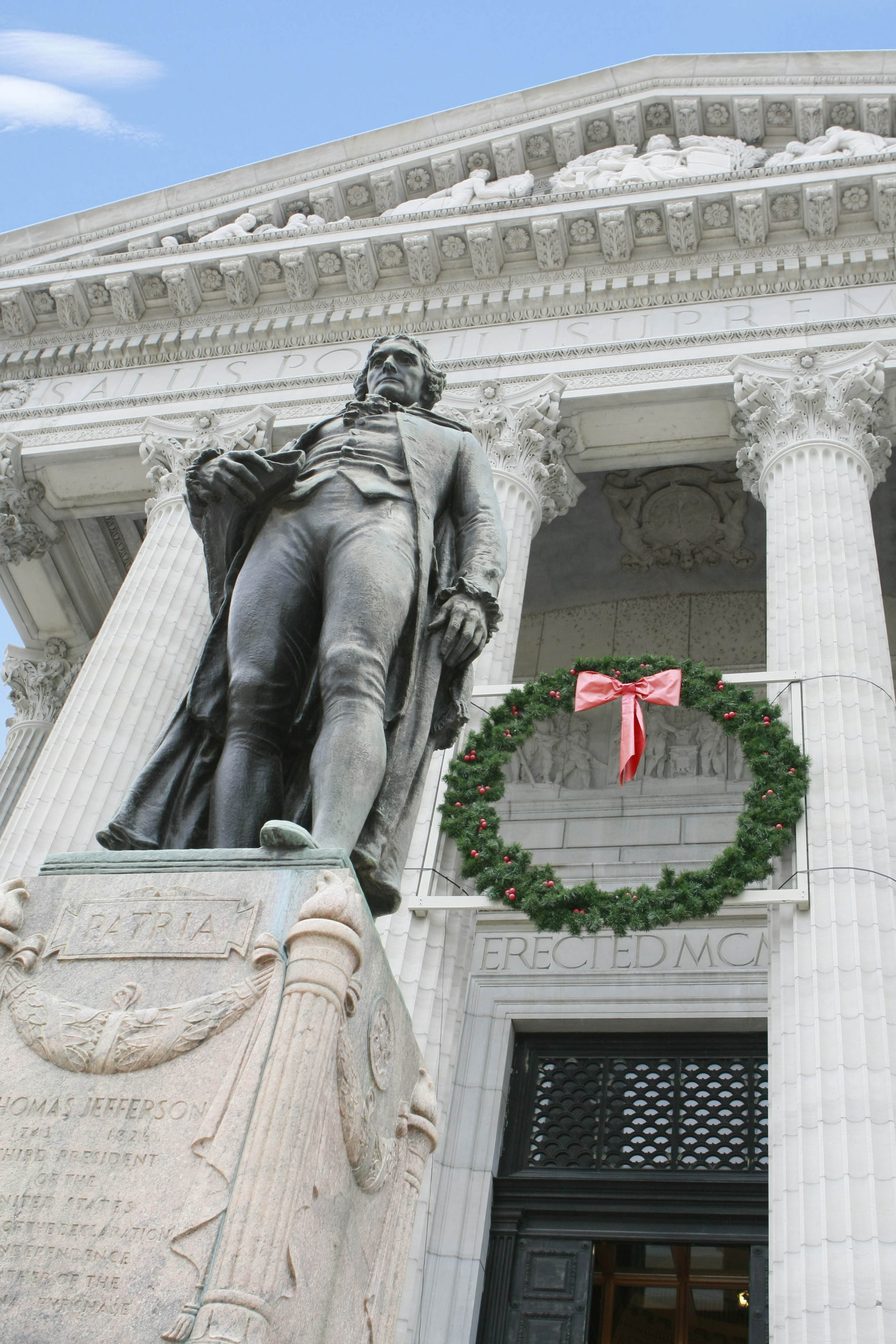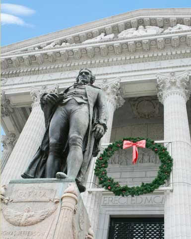 A wreath overlooks the Jefferson statue. |