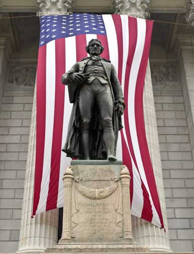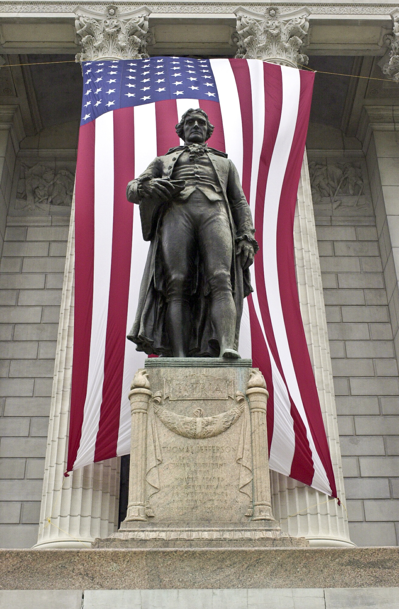 Jefferson statue with the American flag. |
