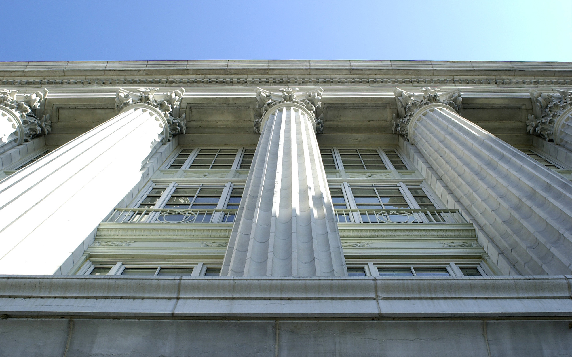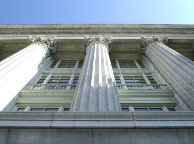A view straight up some of the many columns facing the river. |