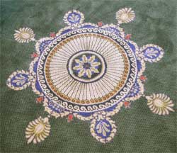 Produced in three pieces, the chamber floor carpet is an olive green in background, on which large circular designs remindful of the interior of the Senate dome are woven at regularly spaced intervals.