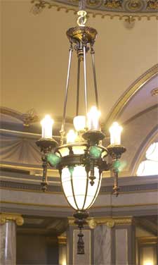 A carefully planned combination of skylights and chandeliers illuminate the Upper Chamber and highlight the magnificent stonework, marble columns and rich walnut furnishings that grace the center of Senate activity.