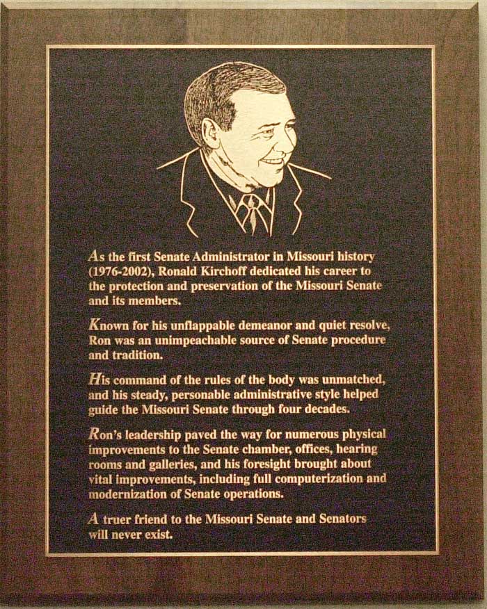 Mr. Kirchoff, who passed away April 27, 2004, was a fixture in the Missouri Senate for 34 years, serving as Director of Printing and Mailing, Director of Research and the position he was most well-known for, that of the first Senate Administrator in Missouri history. Former Sen. Harold Caskey led a motion to name the gallery after Mr. Kirchoff, and the motion was adopted.