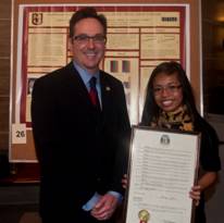 Shown above, Sen. Schaefer with Mekka Garcia, a senior majoring in biochemistry, with her display “Understanding the Bone Abnormalities of a Genetic Disease: Hurler Syndrome.” |
