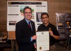 Shown above, Sen. Schaefer with Sital Raj Uprety, a junior majoring in civil and environmental engineering, with his display “Stormwater Pollution Control Using Drinking Water Treatment By-products.” |