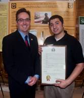 Shown above, Sen. Schaefer with Omar Taranissi, a sophomore majoring in biological science, with his display “A Model of Post-Traumatic Stress Disorder in Mice.” |