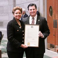 St. Louis March of Dimes Board President Mary Elizabeth Grimes with a Senate Resolution recognizing the organization's 75th Anniversary and its outstanding work. |