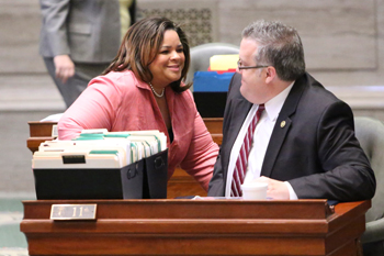 | Senator LeVota speaking with fellow Jackson County college Sen. Shalonn "Kiki" Curls on the Senate floor. |