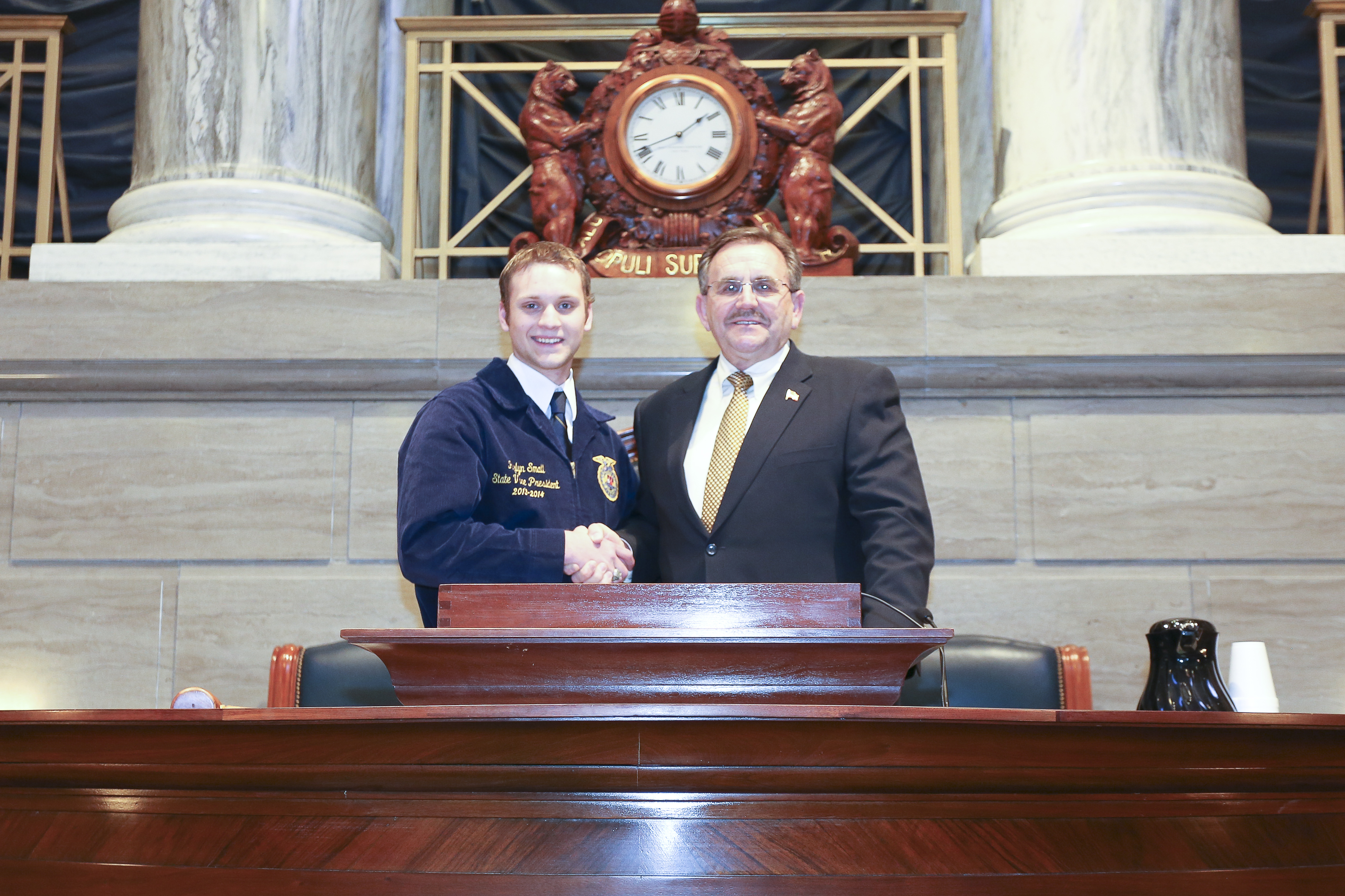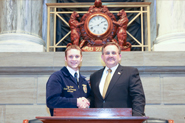 East Prairie FFA member Rylyn Small with Sen. Libla on the dais in the Senate Chamber. |