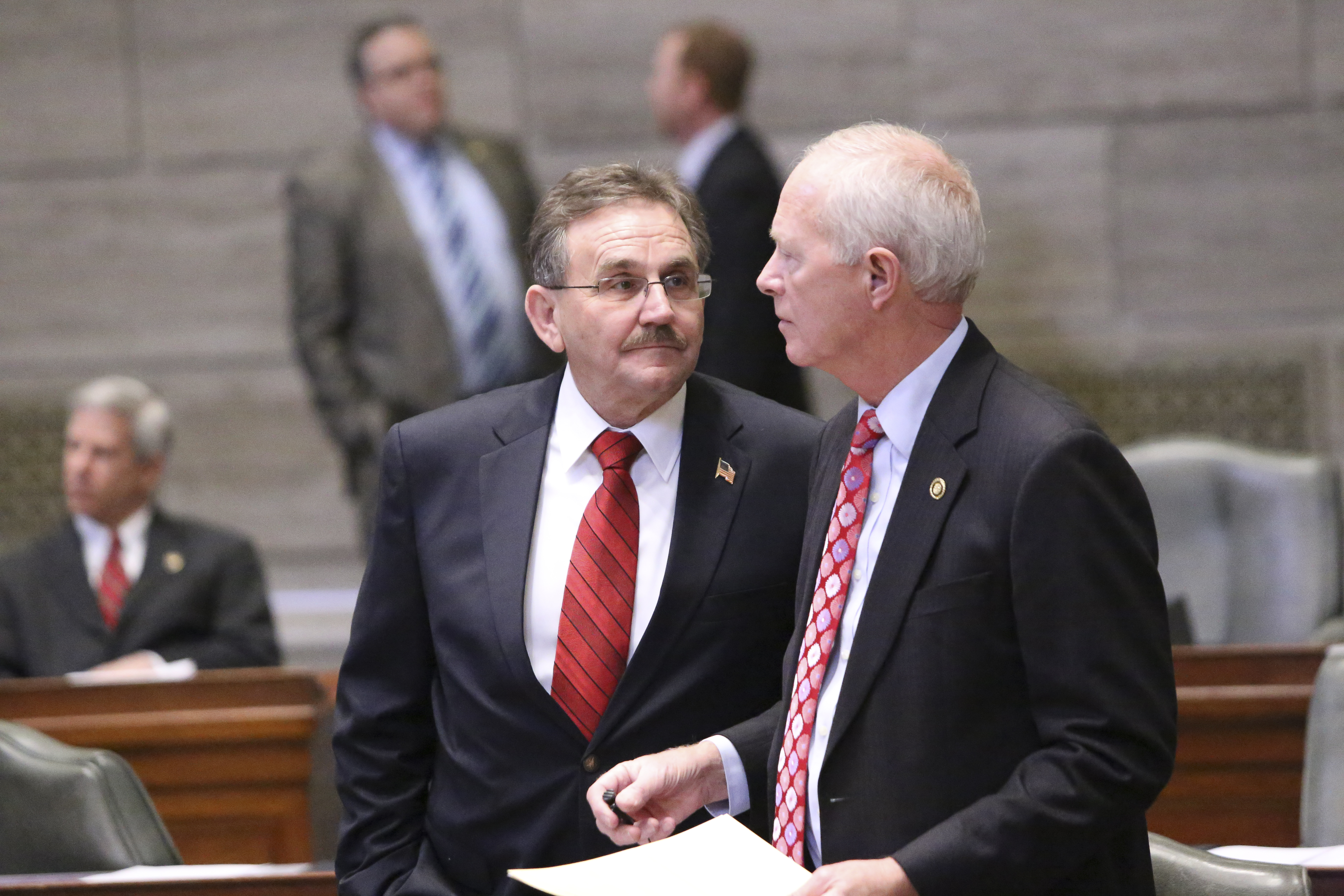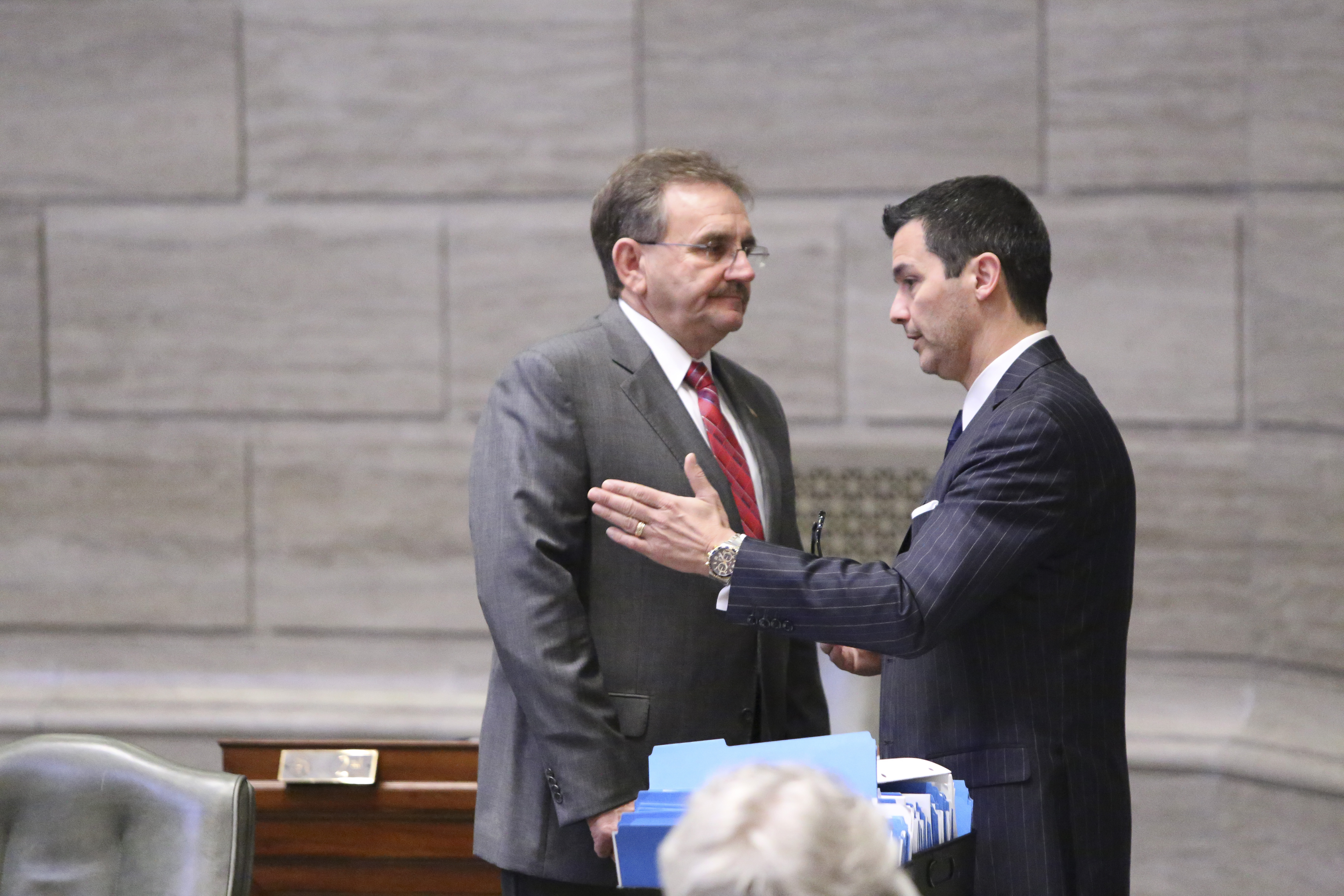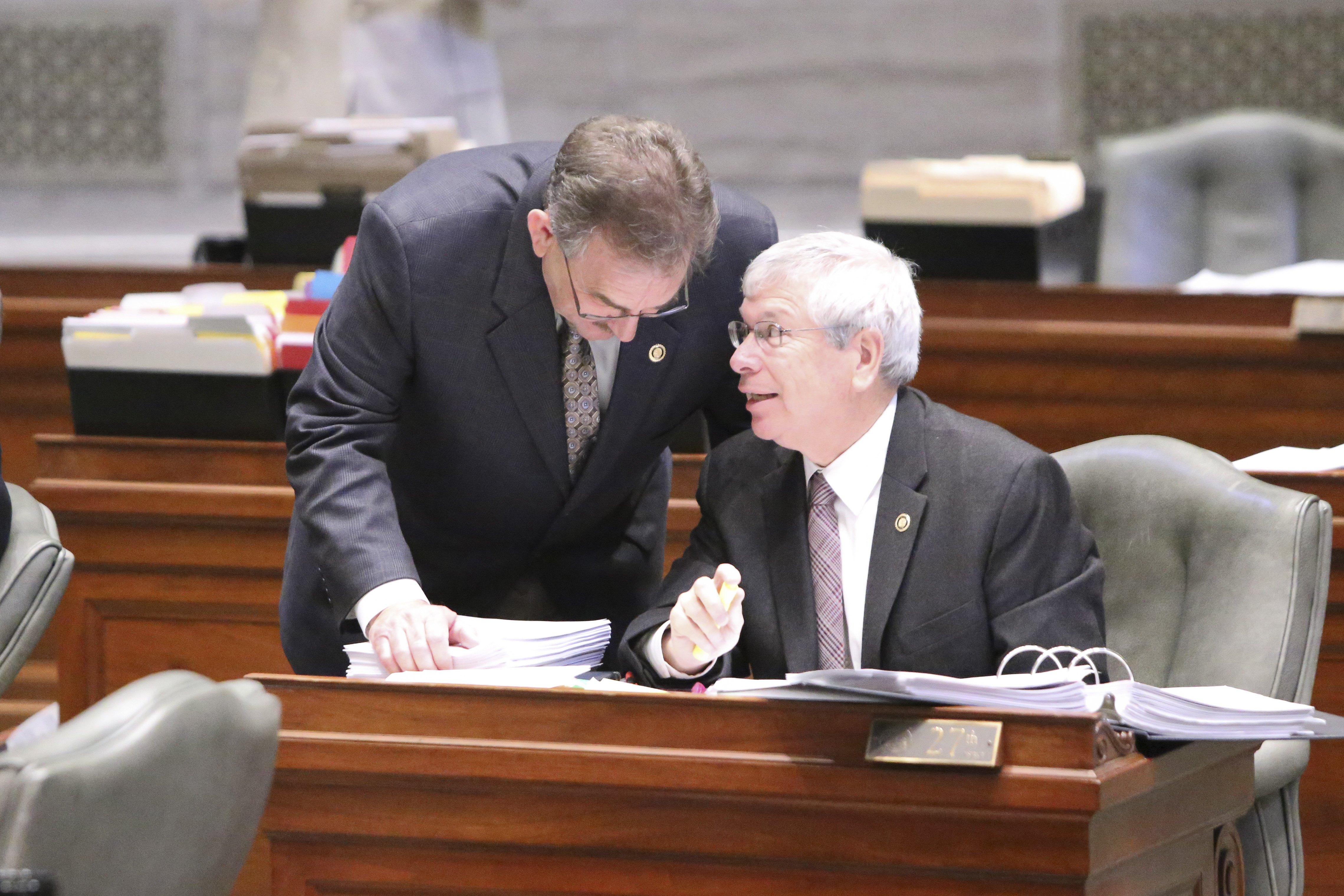 Sen. Wayne Wallingford discuss legislation in the Senate chamber on the last day of session