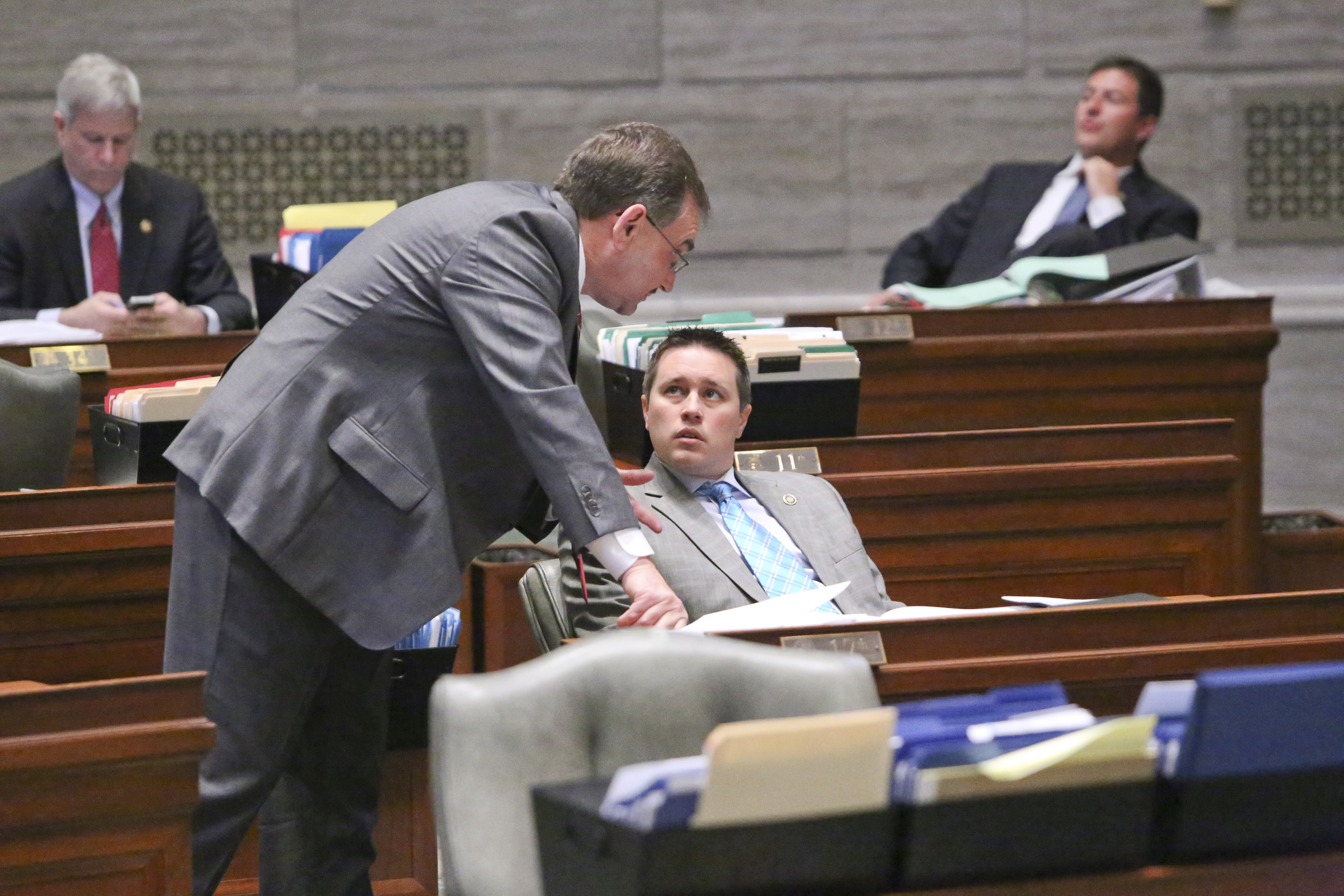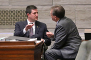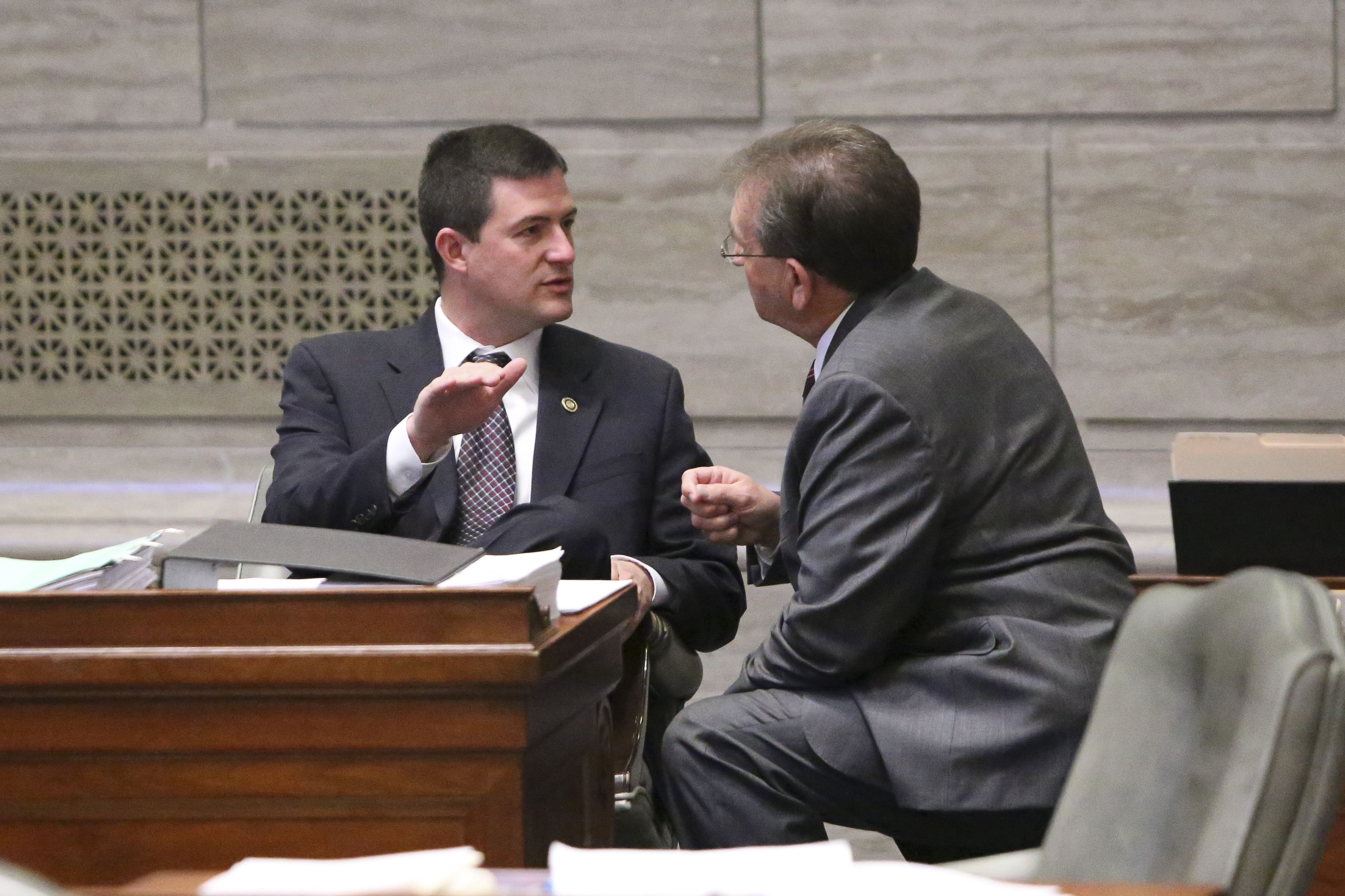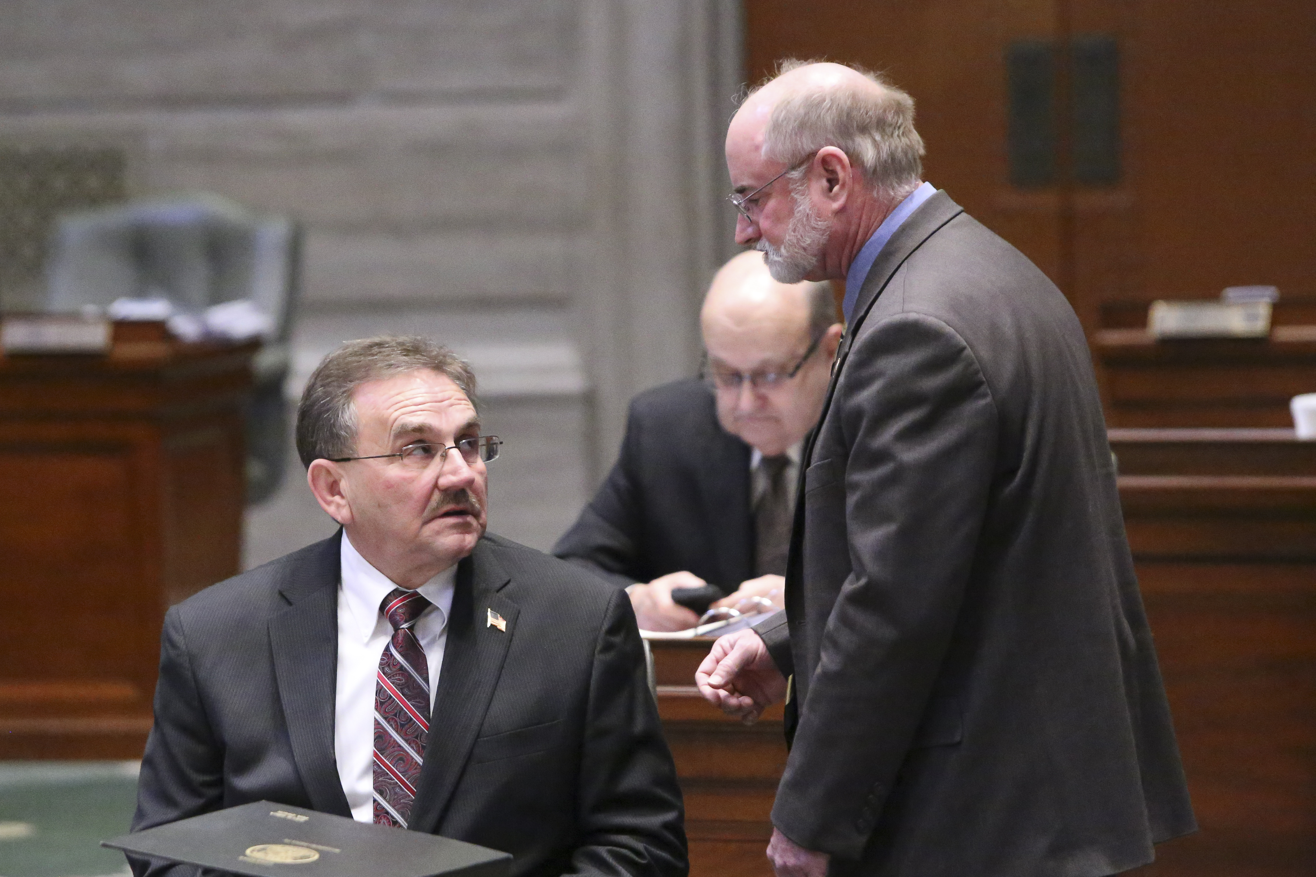 Sen. Wayne Wallingford discuss legislation in the Senate chamber on the last day of session