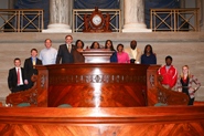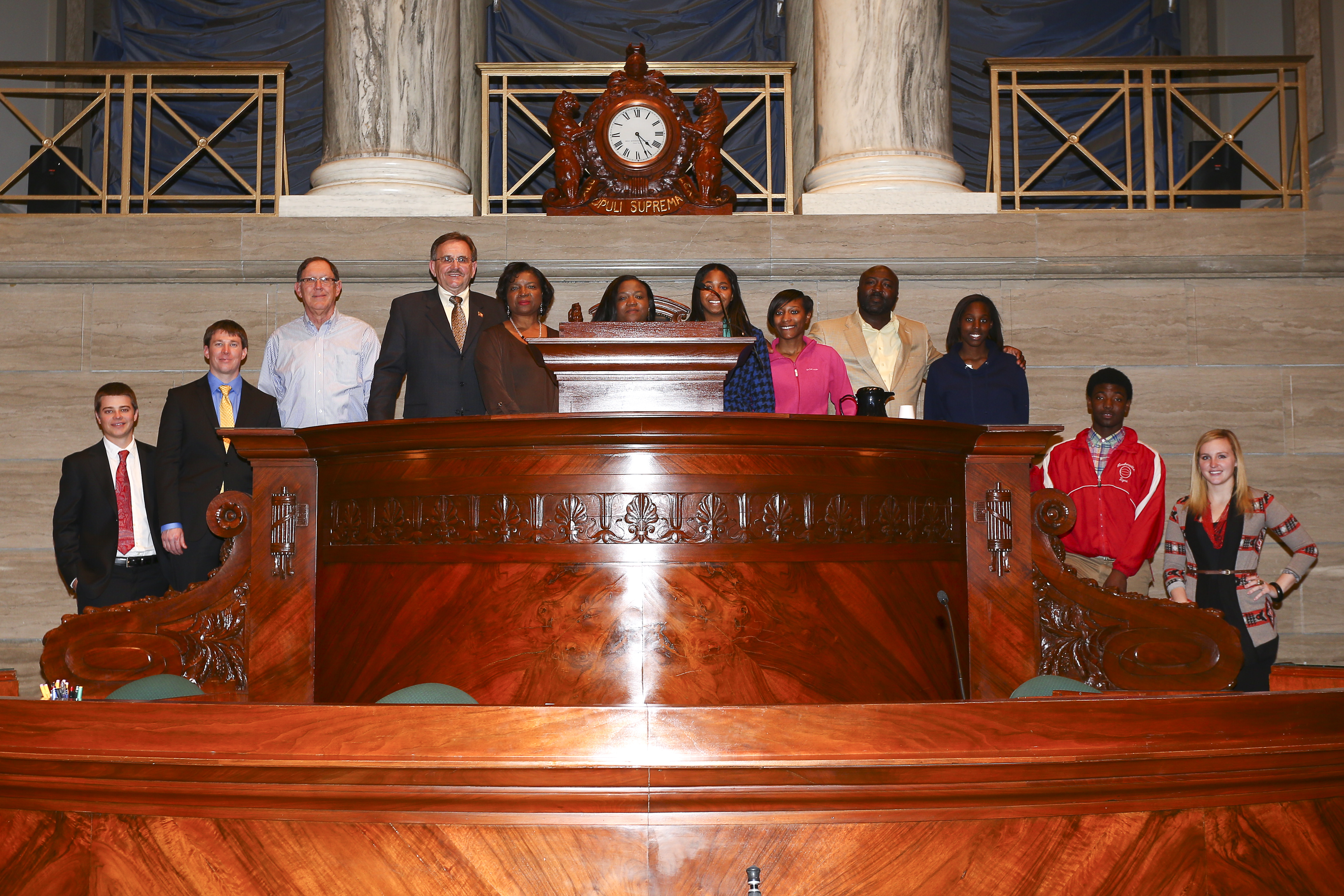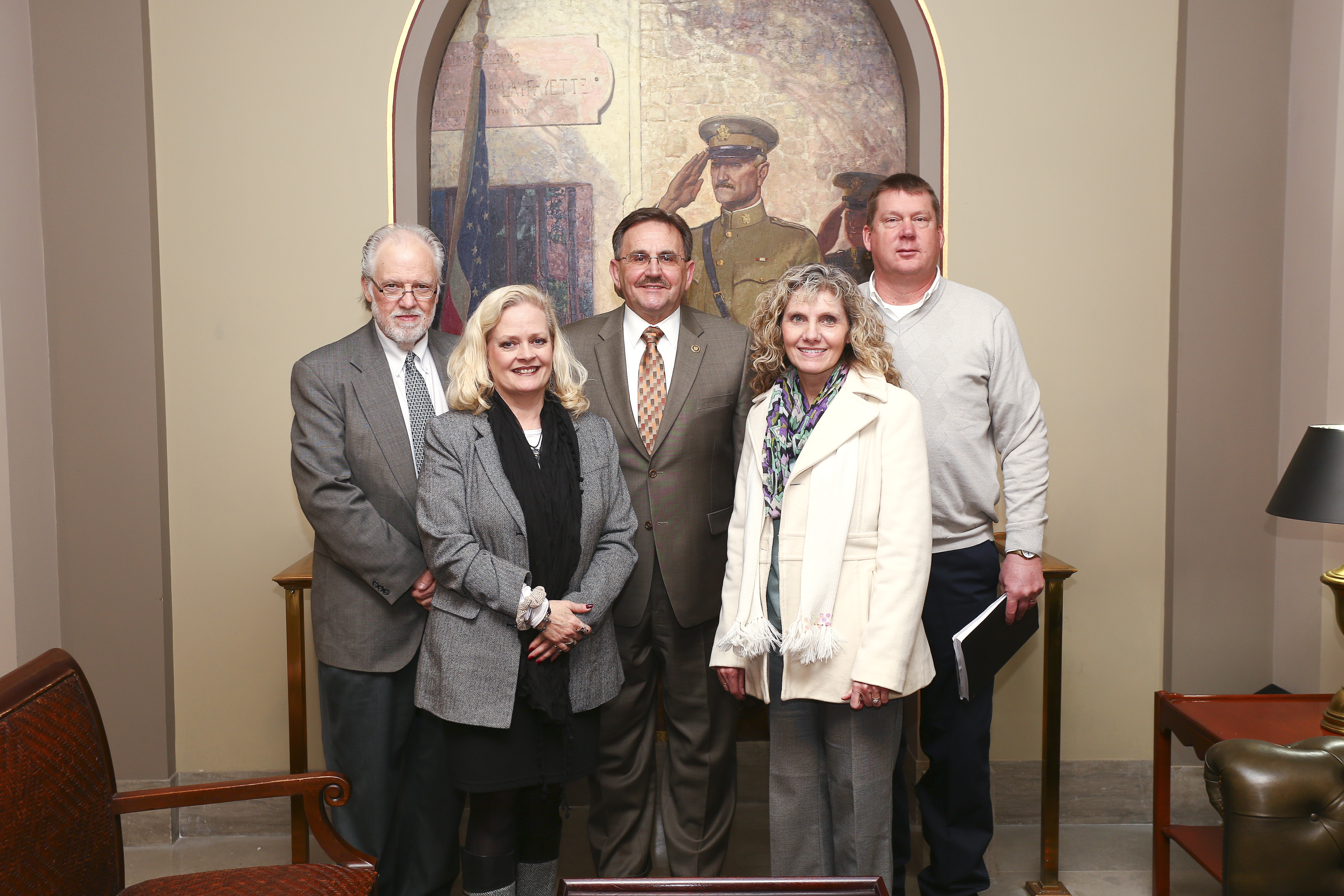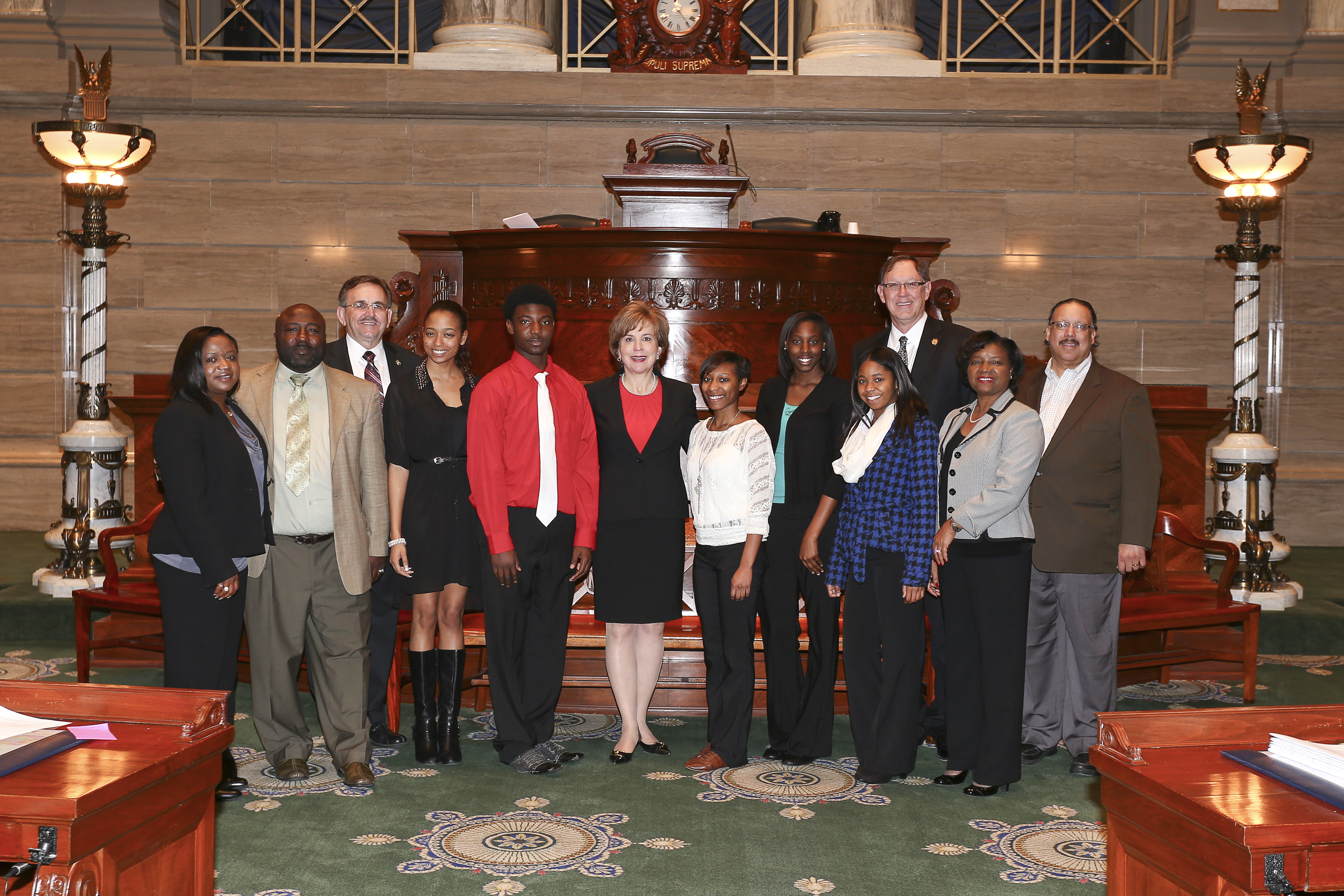 | Pastor Jamie Jones, his wife Deborah, and four students from Caruthersville High School joined Sen. Libla at the State Capitol on Jan. 22, 2014. Chief Justice Mary Russell (pictured far left) met with the group at the Capitol after giving her State of the Judiciary address. |