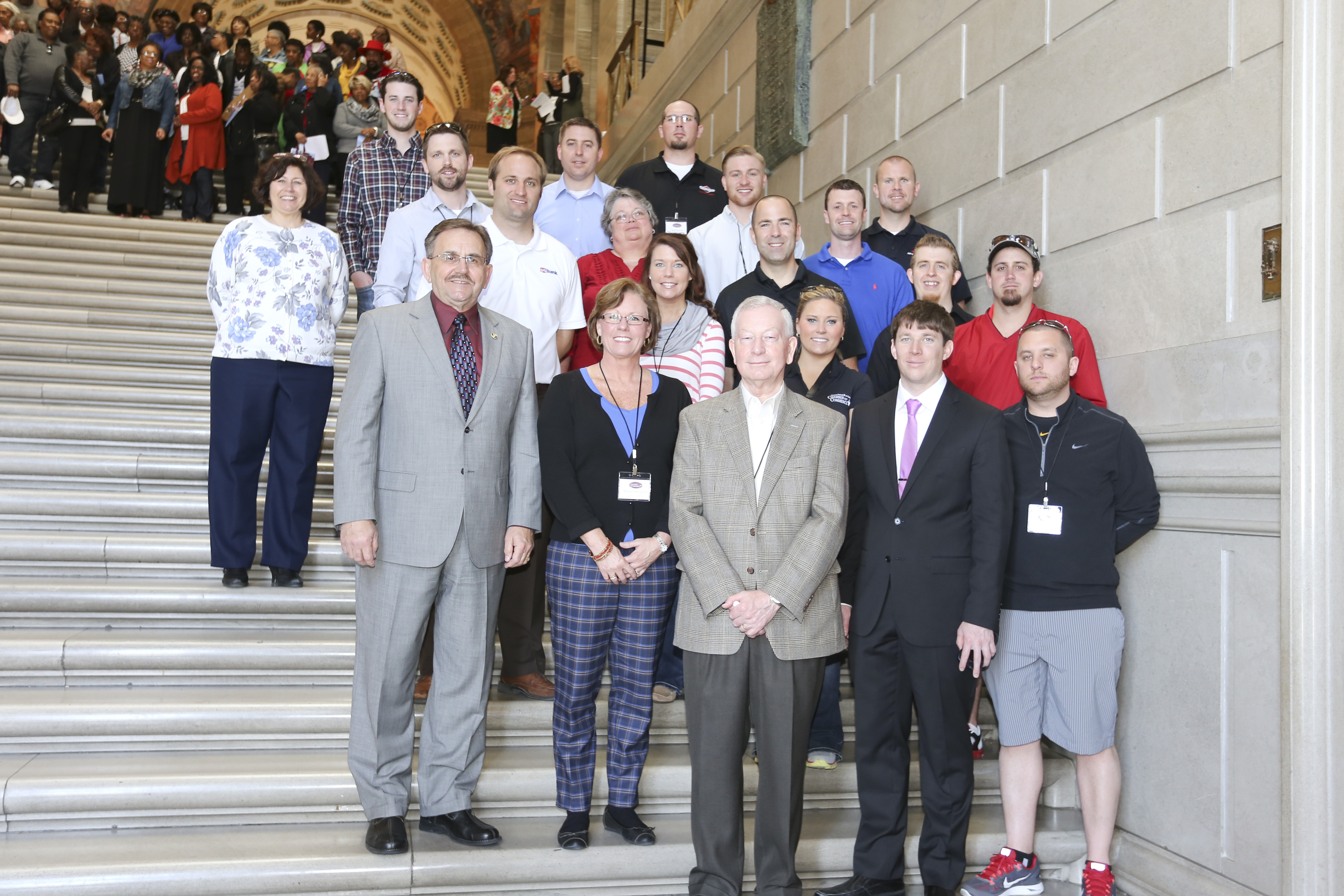 A group of high school students and their chaperones from Caruthersville, Charleston, Hayti, Lilbourn, Sikeston and Steele pose on the grand staircase for a photo with Sen. Libla on March 25, 2014. |