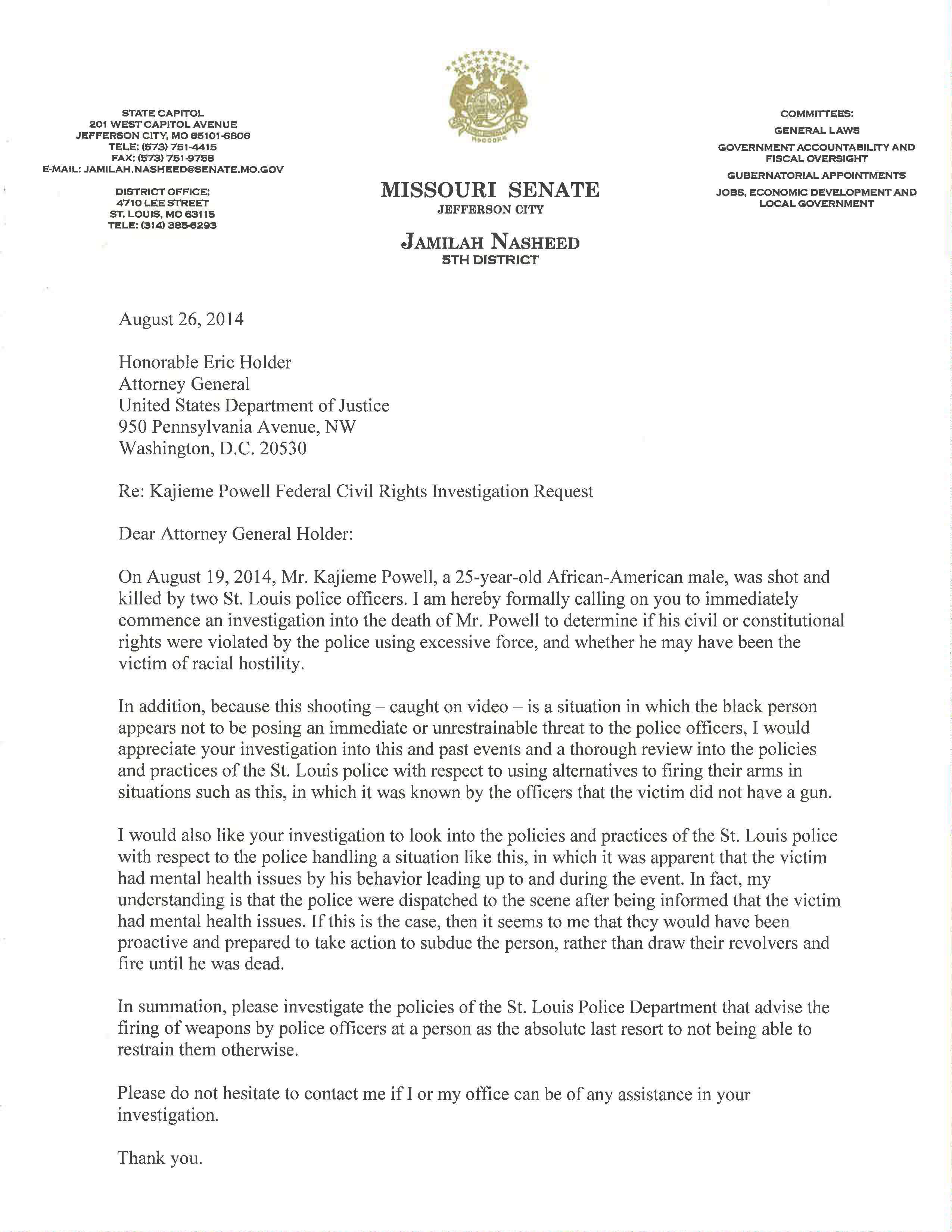 JEFFERSON CITY — Today (8-26), Sen. Jamilah Nasheed, D-St. Louis, sent a letter to U.S. Attorney General Eric Holder, asking him to investigate the situation surrounding the death of 25-year-old Kajieme Powell. Powell lost his life in an altercation with two St. Louis police officers.