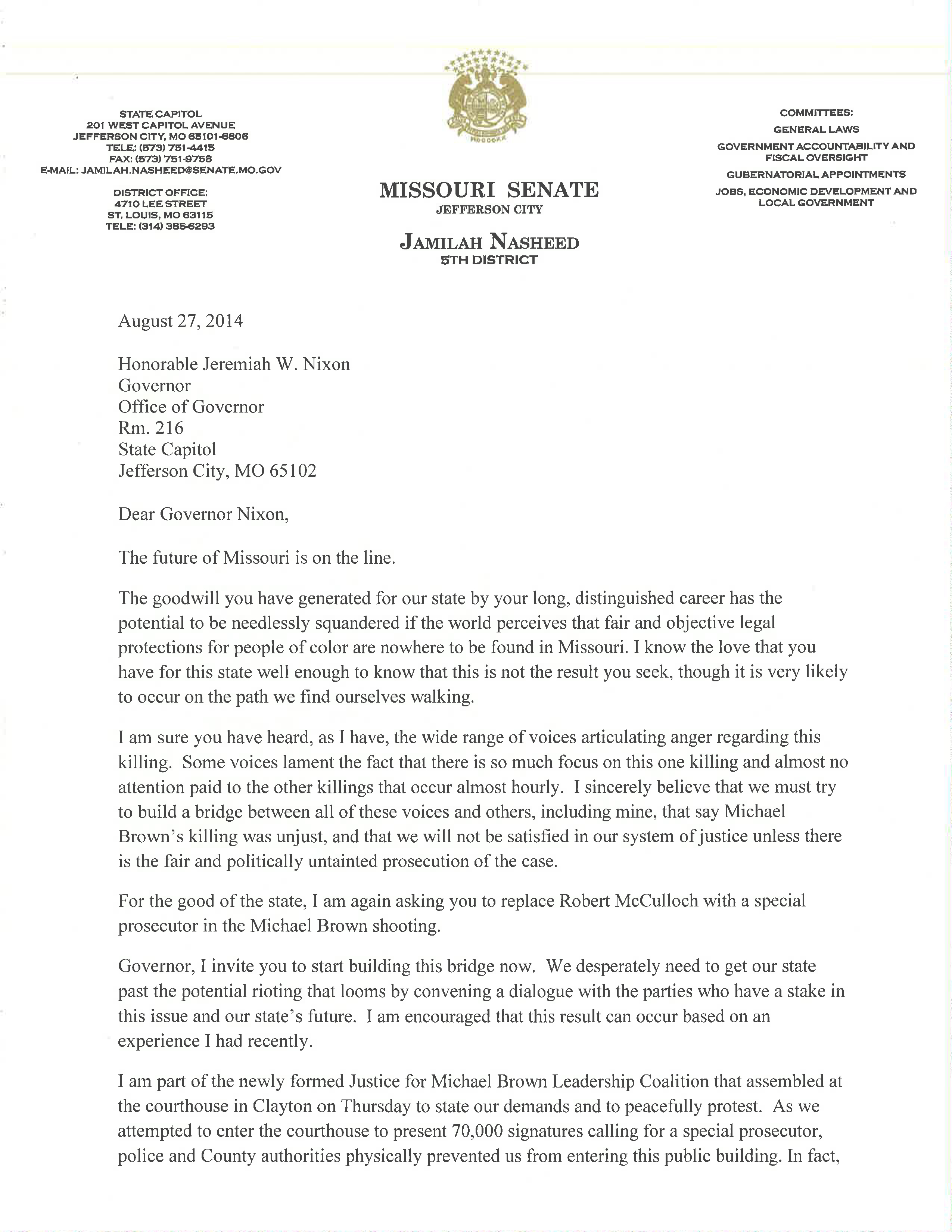 “I can only hope that the governor chooses to see this letter in the way it was intended,” said Sen. Nasheed. “There are many citizens in the St. Louis area, and beyond, who are concerned that St. Louis Prosecutor Robert McCulloch will not approach this case with an unbiased eye.”