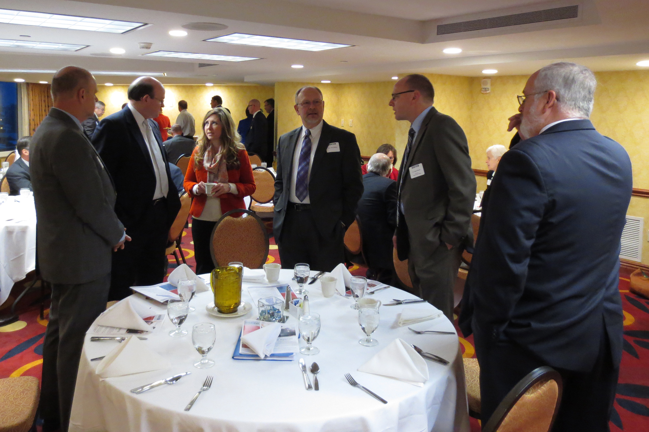 Shown above, Sen. Gary Romine, R-Farmington, center, speaks with members of the Missouri Community College Association, from left to right, Dr. Kent Farnsworth, interim president of Crowder College; Dr. Hal L. Higdon, chancellor and president of Ozark Technical College-Springfield; Zora Mulligan, executive director of the Missouri Community College Association; Sen. Romine; Dr. Steve Kurtz, president of Mineral Area College; and Dr. Ray Cummiskey, president of Jefferson College during its annual 2014 legislative breakfast on Wednesday, Jan. 15, 2014. |