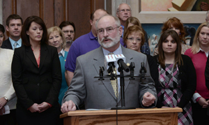 | Senator Munzlinger addresses attendees of an informational meeting regarding House Bill 1327, a measure that would require health benefit plans to establish equal out-of-pocket costs for covered oral and intravenously administered chemotherapy medications, a proposal supported by Sen. Munzlinger. |