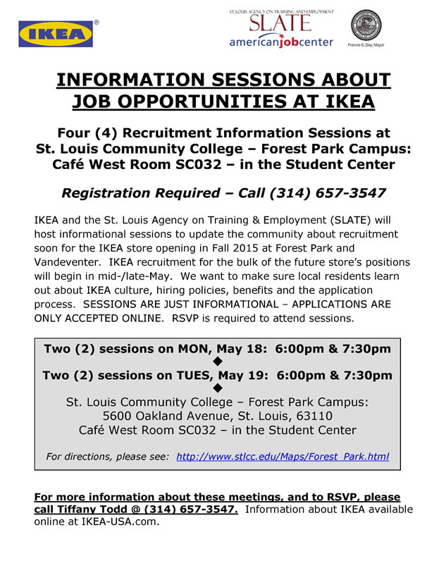 Senator Nasheed would like to remind anyone interested in working at the new IKEA location in St. Louis City to attend any of four informational sessions on Monday, May 18th and Tuesday, May 19th at Forest Park Community College. More details on the flyer below.