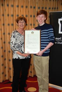 Rock Bridge High School junior, Neil Cathro was presented with a resolution to recognize his accomplishment as the Central Missouri State Regional Poetry Out Loud Champion. This achievement advanced him to the Missouri State Competition. The competition is sponsored annually by the Missouri Arts Council.