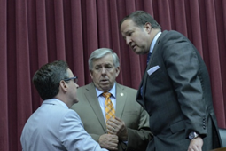 Senator Schaefer converses with Senator Mike Parson (R-Bolivar) and Representative John Diehl (R-Town and Country) on House Bills 17, 18 and 19 in the House chambers.