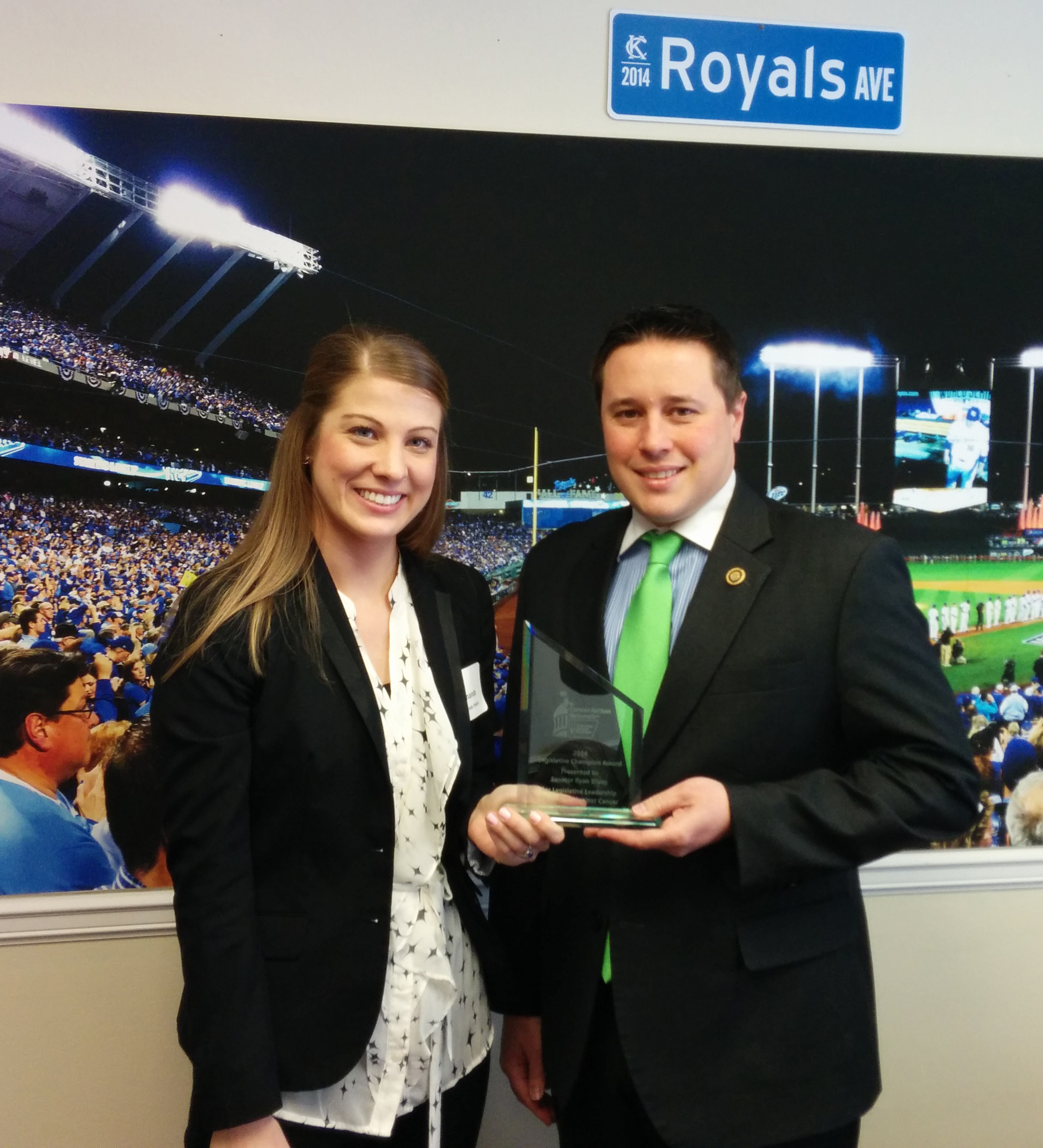| Shown above, Sen. Ryan Silvey, R-Kansas City, accepting the Legislative Champion Award from Amanda Petelin of the American Cancer Society for his oral chemotherapy legislation that was signed into law and will help provide options and contain costs for individuals and families battling cancer. |