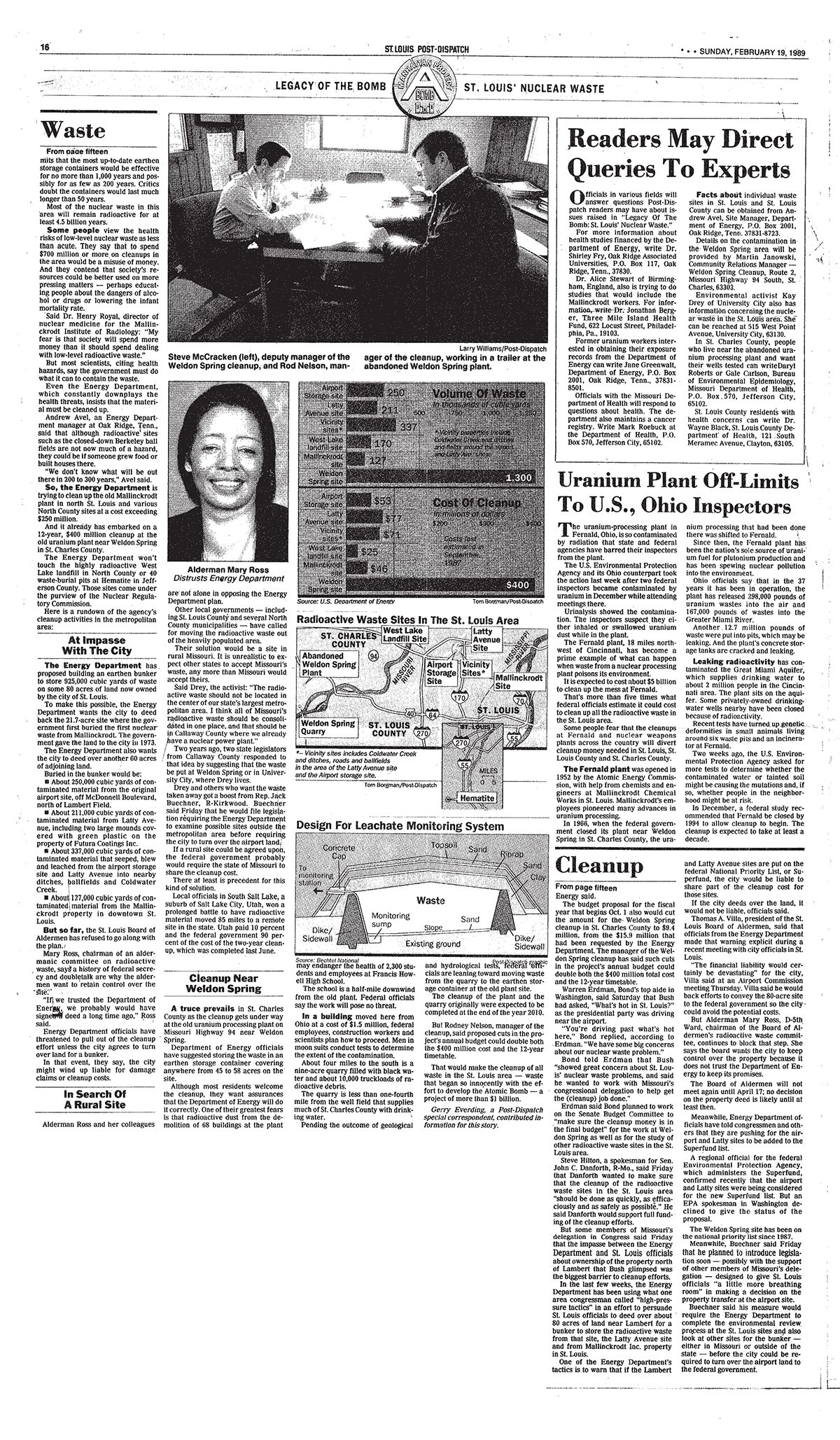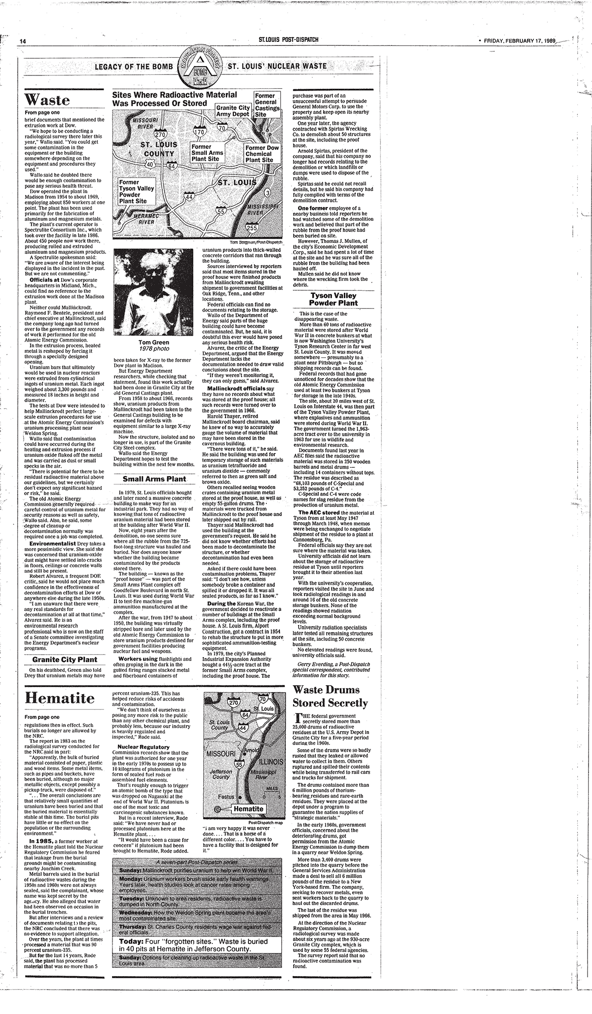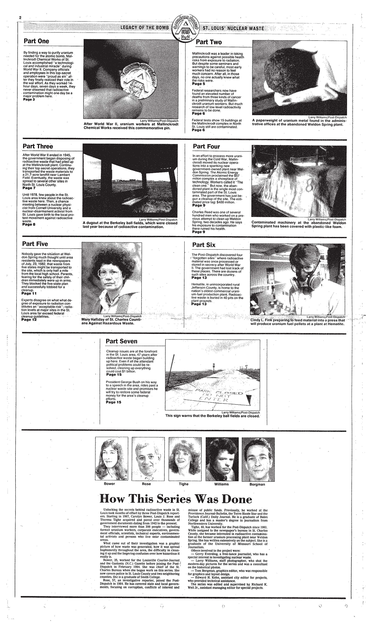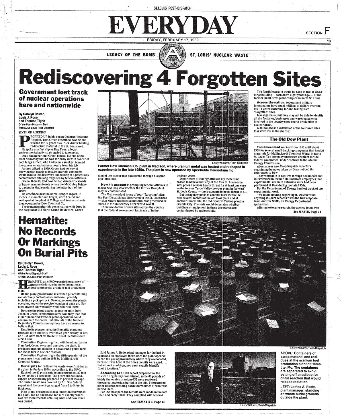 The investigative newspaper series, titled "Legacy of the Bomb," focuses on the harmful nuclear waste dumps in St. Louis County, and the horrific impact they have had on our home. Though the story is almost 30 years old, the narrative still rings true today. Please give this movie and series your attention as they detail the sordid past of one of our area's most tragic tales.