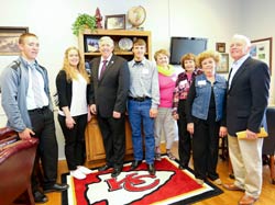 Sophomore Pilgrimage-Polk County: Clay Martin, Paige Harman, Senator Parson, Cody Westfall, Susan Strait, Becky Legan, Sharon & former State Senator Morris Westfall.